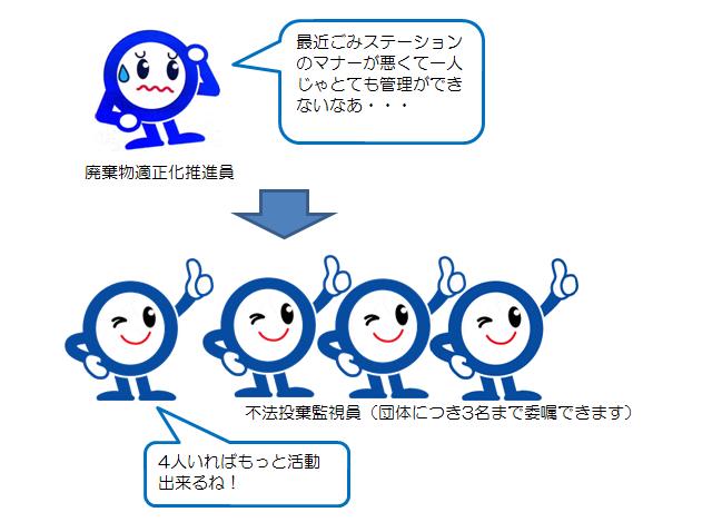 不法投棄監視員とは、平成25年6月より創設され、課題の多い地域を対象に、各自治会からの推薦を受けた方が、市長が必要と認めた方を原則3名まで、不法投棄監視員として委嘱します。職務は廃棄物適正化推進員をサポートし不法投棄の防止等の活動が主な業務となります。