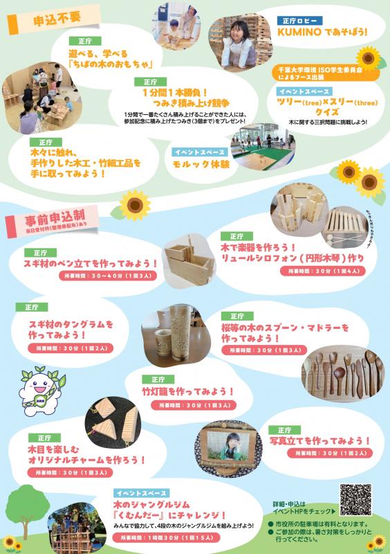 千葉県産材を利用したおもちゃや木工作等の体験を通して、幼児~小学生に木に親しんでもらうとともに、森林の健全な育成や温暖化対策における吸収源の整備等、森林の大切さについて理解を深めてもらうため、木育イベントを実施します。