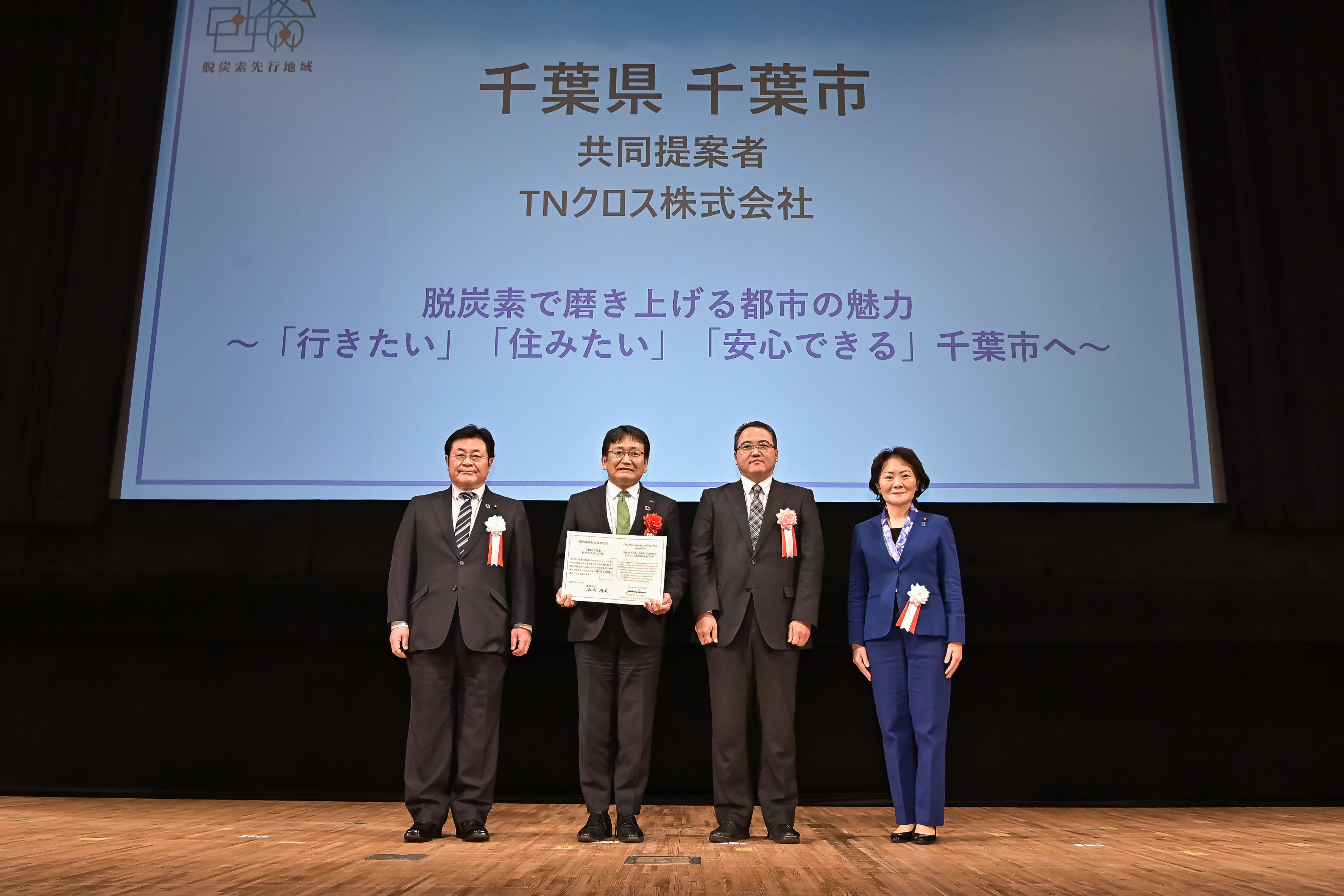 令和4年12月20日に開催された脱炭素先行地域選定証授与式において、西村明宏環境大臣より、神谷俊一市長及び共同提案者であるTNクロス株式会社 渡邉茂道代表取締役社長に選定証が授与されました。