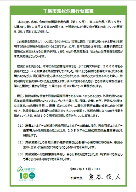 千葉市では、地球規模で直面している気候危機を、市民、団体、企業、大学、行政などの様々な主体が共有し、将来世代へ持続可能な社会を繋いでいくため、気候危機に立ち向かう行動を進めていくことを目的とし、本日「千葉市気候危機行動宣言」を公表しました。