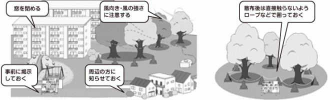 個人や建物の管理者などで農薬を使用する可能性のある方は、農薬の飛散を原因とする健康被害が生じないよう、できるだけ農薬を使用しない管理を心がけましょう。また、農薬を散布せざるを得ない場合でも、必要最小限に留め、農薬の飛散防止に努めるなど、周辺の方に十分な配慮をしましょう。