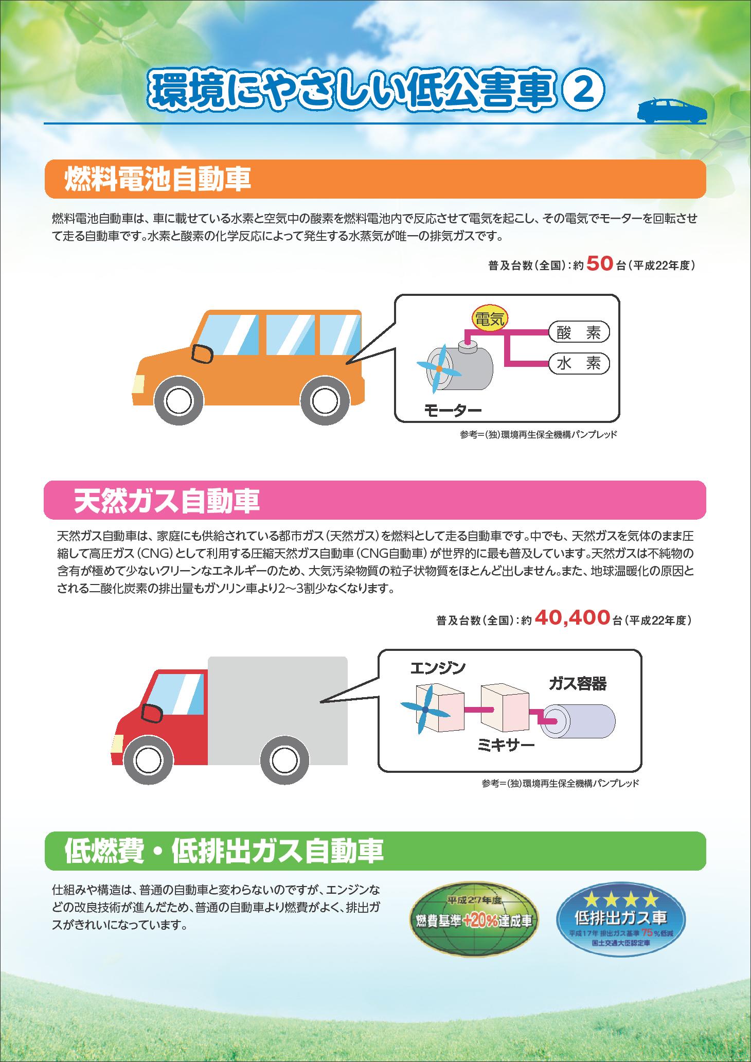 環境に優しい低公害車2 (燃料電池自動車、天然ガス自動車、低燃費・低排出ガス自動車)(JPG:338KB) |