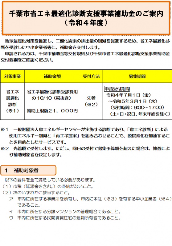 【事業者・集合住宅の管理組合向け】 省エネ最適化診断支援事業補助金のご案内 |