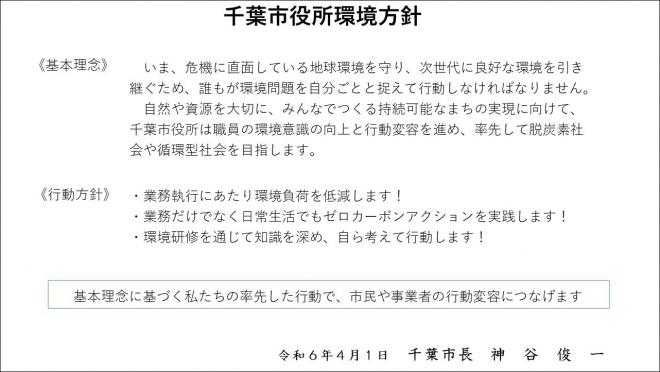 千葉市役所環境方針は、市長が定める、市役所として環境問題にどのように取り組んでいくのかについて基本的な考えを示したものです。