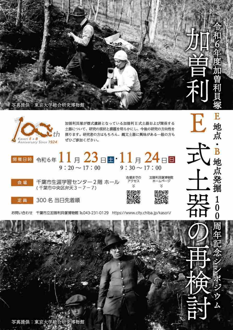 シンポジウム 加曽利貝塚E地点・B地点発掘100周年記念シンポジウム「加曽利E式土器の再検討」 令和6年11月23日(土曜日・祝日)9時20分~17時00分・24日(日曜日)9時30分~17時00分 2024年は、大正13(1924)年に東京帝国大学人類学教室による加曽利貝塚E地点・B地点の発掘調査が行われてから100周年となります。加曽利貝塚が標式遺跡となっている加曽利E式土器および関係する土器について、研究の現状と課題を明らかにし、今後の研究の方向性を探ります。 11月23日(土曜日・祝日) 11月24日(日曜日) |