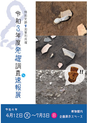 令和3年度に実施した発掘調査の速報展を開催します。令和2年度までの調査成果の一部や、整理作業で新たに認識するに至った追加知見などを踏まえた展示となっています。