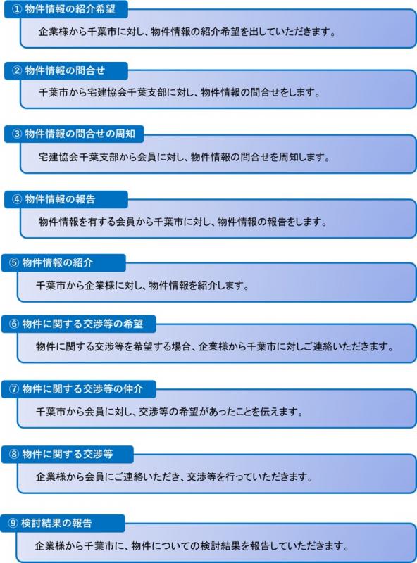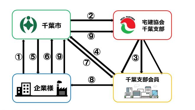 企業様からご要望のあった物件情報について、千葉市が宅建協会千葉支部のご協力を得て会員から入手し、企業様にご紹介します。