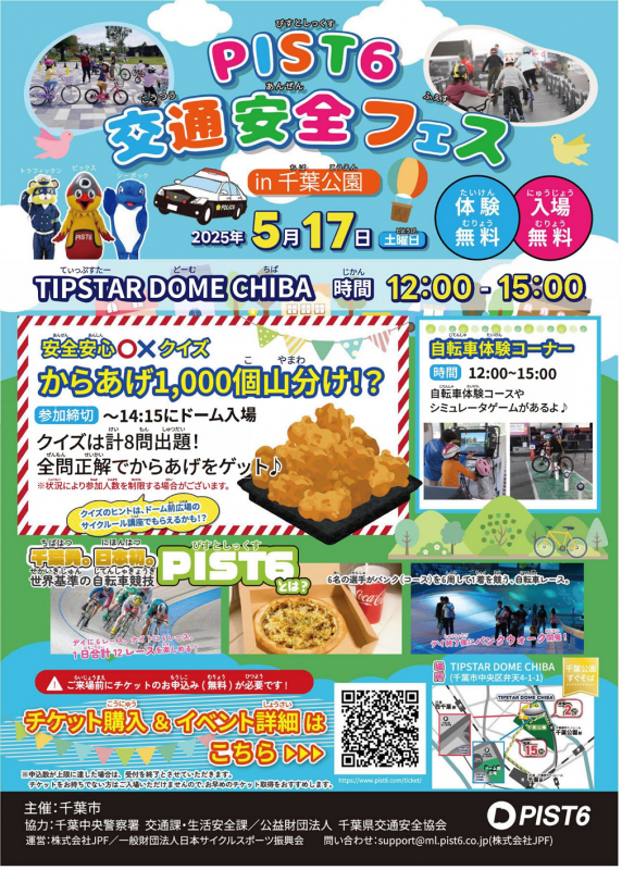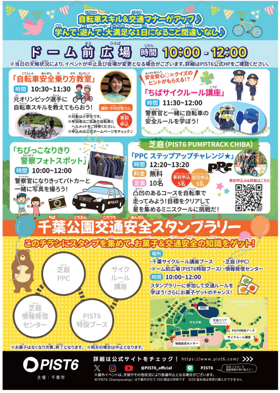 このたび、PIST6の開催に併せて、千葉中央警察署・公益財団法人千葉県交通安全協会と連携し、交通安全イベント「PIST6交通安全フェスin千葉公園」を実施します。