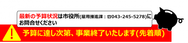※予算上限まで残りわずかとなっているため、新規の申請を受け付けられない可能性があります。申請書類の提出前に雇用推進課(電話番号:043-245-5278)までご連絡ください。