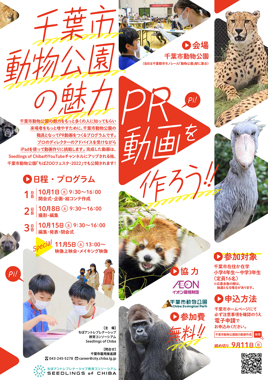 ホーム > 子育て・教育 > 保育・教育・健全育成 > その他保育・教育・健全育成 > アントレプレナーシップ(起業家精神)教育 > アントレプレナーシップ教育の推進 > 【イオン環境財団×千葉市動物公園】千葉市動物公園の魅力PR動画を作成しよう!by Seedlings of Chiba