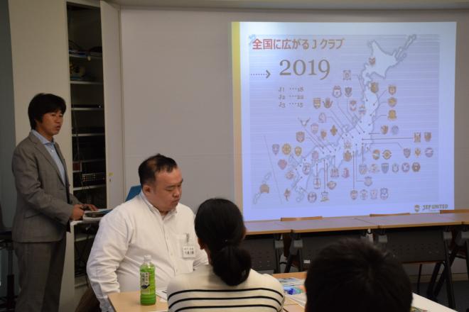 ジェフユナイテッド市原・千葉から講師を招き、ジェフ千葉が地域で展開する事業について講義を行いました。
