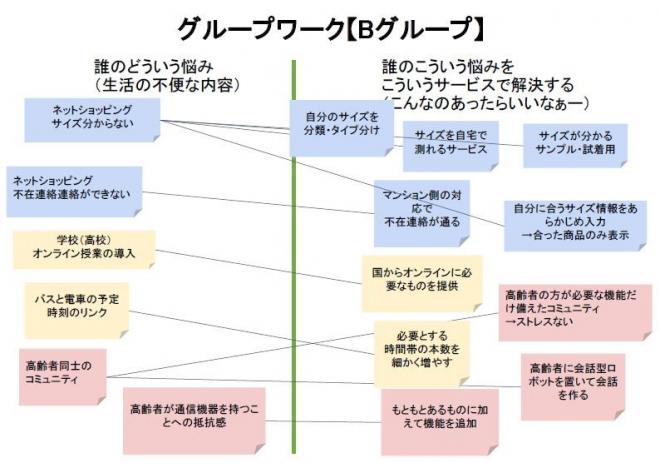 その後、「身の回りの困りごとをITで解決する方法を考える」というテーマで、グループに分かれてアイデア出しを実施しました。