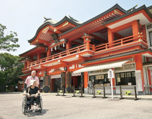 バス停の目の前にある鳥居ではなく、通町公園側や自動車祈願側から行くと車いすの方でも容易に境内に入れます。境内にはほぼ段差がなく、車いすで参拝ができます。