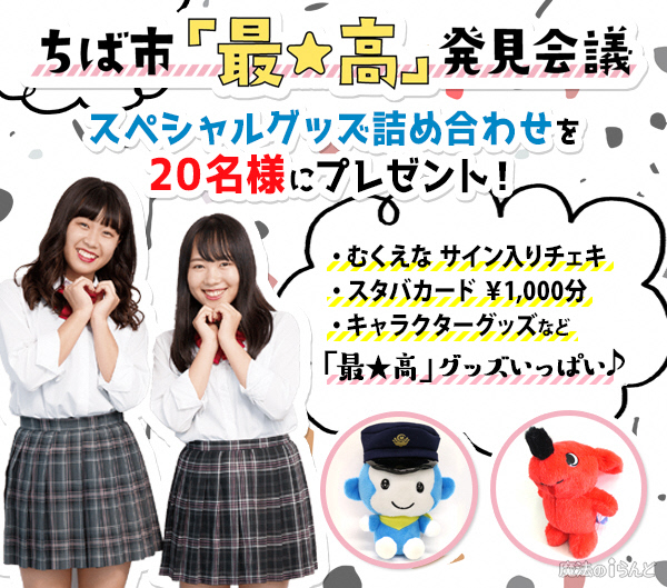動画「ちば市『最★高』発見会議」を見て、「#ちば市サイコー」のハッシュタグがついたキャンペーン投稿をリポスト頂いた方のうち、抽選で20名様に動画内に登場したグッズなどを集めたちば市「最★高」グッズセットをプレゼント!