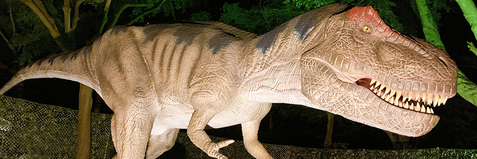 8,000万年の時空を超えて、昭和の森にリアルな恐竜たちが集結!夜の森をライトをもって探検しよう。