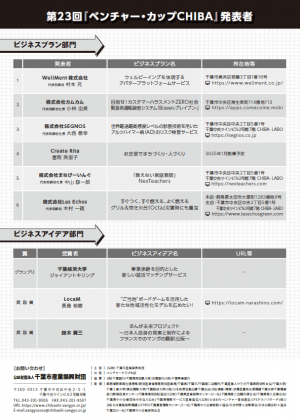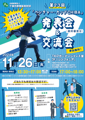(公財)千葉市産業振興財団は、本市発の将来性ある新たなビジネスの創出を目指したビジネスプランコンテスト「第23回『ベンチャー・カップCHIBA』」発表会を令和6年11月26日に開催しました。