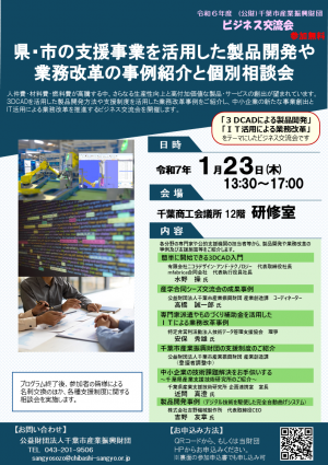 (公財)千葉市産業振興財団では、事業者向けの各種研修・セミナー・交流会を実施しています。お申込み、詳細については下記の「関連リンク」に記載の千葉市産業振興財団へお問い合わせください。
