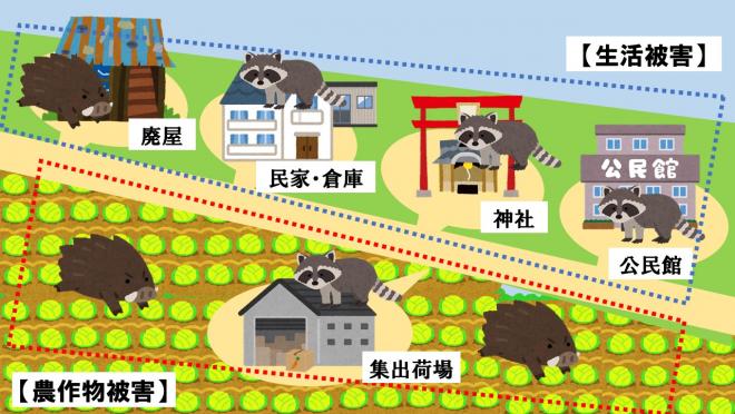 現在市内において、ハクビシン・アライグマ・イノシシによる「生活被害および農作物被害」が発生しております。