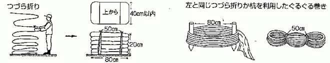農業用ビニールの結束方法 廃ビニールA 平成23年3月に展張されていた使用済みビニール 水で洗ってから梱包して下さい。 特に土の部分は切り離し水洗いをして下さい。つづら折りにし、排出ビニールと同種類のものをひもにして2か所を結束します。 廃ビニールB 廃ビニールA以外のビニール 廃ビニールAほど厳しくは求めませんが、できる限り土を落としてから梱包して下さい。 つづら折りにし、排出ビニールと同種類のものをひもにして2か所を結束します。 農業用ポリなどビニール以外の結束方法 水で洗う必要はありませんが、土などをできるだけ除去していただきます。 ビニールと同じ結束方法か、杭を利用しぐるぐる巻きにして同種類のものかマイカ線などを利用し2か所を結束します。 ポリポット(軟質系)の結束方法 土などをできるだけ除去し、マイカ線などを穴に通し幅80cm程度のリング状に結束します。