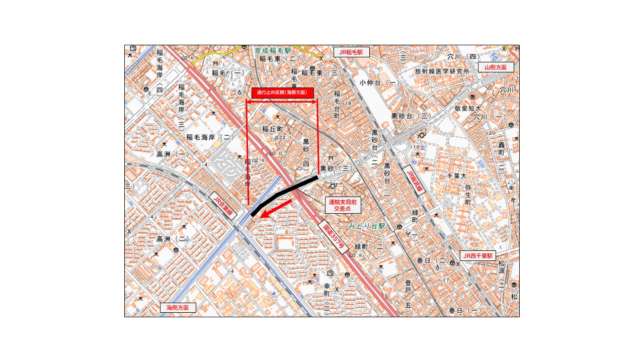 ホーム > 市政全般 > 組織案内 > 組織から探す > 建設局 > 建設局土木部土木管理課 > 工事等に伴う通行規制のお知らせ > 【通行規制解除】通行規制のお知らせ(新港穴川線:千葉市美浜区幸町2丁目)(運輸支局入り口付近~稲毛区役所)