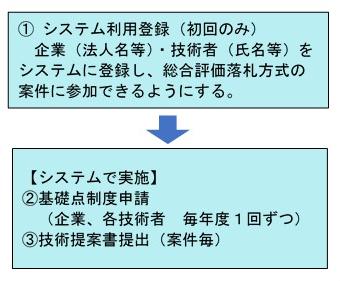 ・総合評価落札方式として公告された工事案件に参加する企業が、同年度中に、まだ基礎点制度申請をしていない場合には、期限内に「企業」基礎点申請をしてください。また、当該入札における配置予定技術者について、同年度中に、まだ基礎点制度申請をしていない場合には、期限内に「技術者」基礎点申請をしてください。