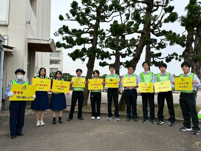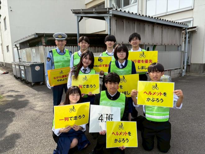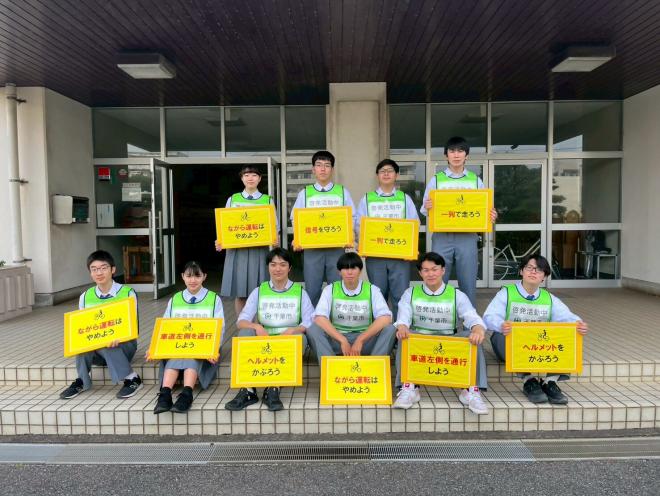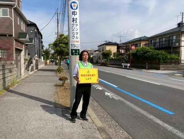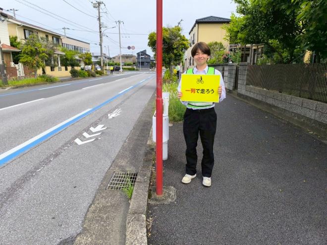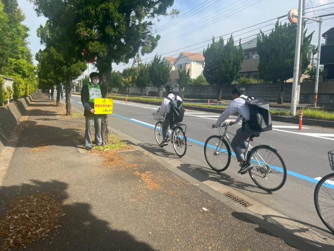 実施対象区域内の歩道にて、自転車の安全利用を促す内容を示したプラカードを持ち、通行する自転車利用者などに呼びかけを行いました。