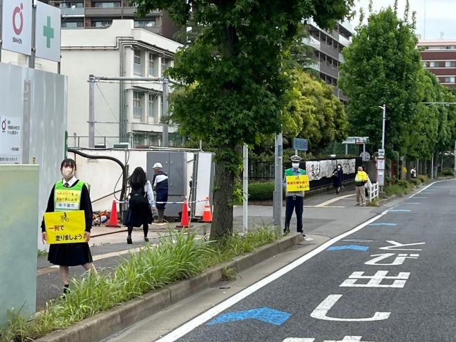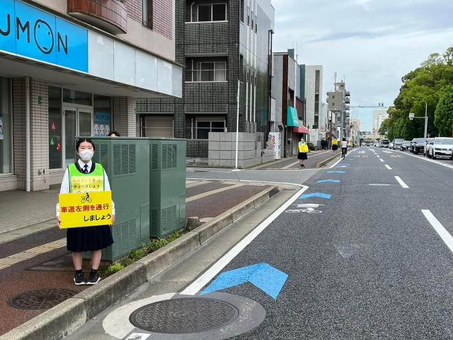 実施対象区域内の歩道にて、自転車の安全利用を促す内容を示したプラカードを持ち、通行する自転車利用者などに呼びかけを行います。