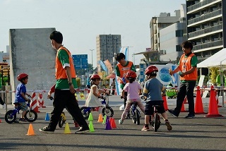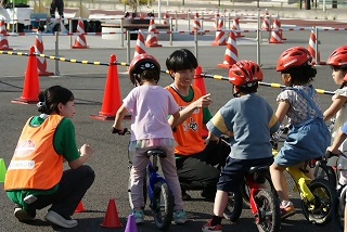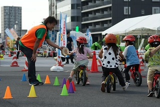 ランバイク(ペダルなし自転車)に乗り、簡単なゲームを通じて、楽しみながら自転車の乗り方を学んでいただきました。