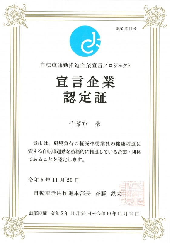 日常の生活で自転車を活用できる自転車通勤を推奨するため、市の率先行動の一つとして国土交通省が創設した「『自転車通勤推進企業』宣言プロジェクト」において、千葉市役所が「宣言企業」に令和5年11月20日付けで認定されました。