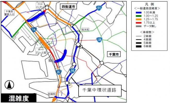 混雑度については特に国道357号と国道126号が高く、次に国道16号の穴川IC~貝塚IC間が高くなっています。その他の区間においては混雑度は1以下となっています。なお、混雑度の高い区間では、新設道路の整備、現道の道路改良などによる混雑緩和が必要です。