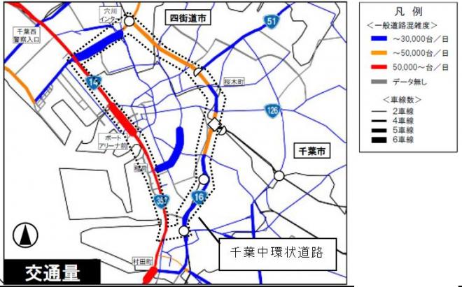 千葉中環状道路の交通状況としては、国道357号の交通量が最も多く、50,000台/日以上の交通量となっています。また、次に多いのは国道126号及び国道16号で30,000台/日以上となっています。千葉市道の新港横戸町線は最も交通量が少なくなっております。