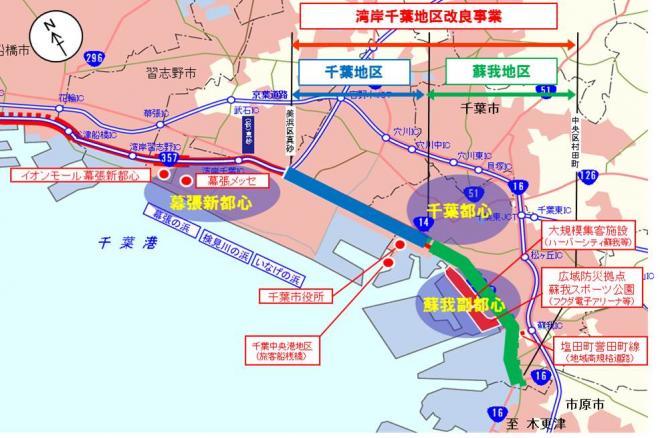 市内の国道357号のうち、湾岸千葉地区改良事業(千葉地区)(以下「千葉地区」)については2016年10月に全線が開通しましたが、延伸部にあたる湾岸千葉地区改良事業(蘇我地区)(以下「蘇我地区」)においても主要渋滞箇所が連担し、その平均旅行速度は改良を行った千葉地区や市原地区と比べ著しく低くボトルネックとなっていることから、2017年度に事業化されました。千葉地区の整備と一体となって輸送時間・通勤時間の短縮や定時制・速達性が確保され生産性が向上するなどのストック効果が期待されております。