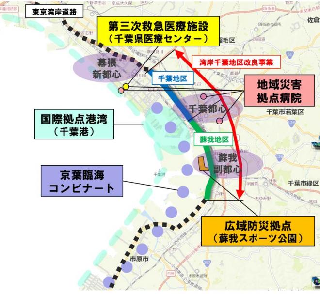 国道357号の周辺には京葉臨海コンビナート、国際拠点港湾(千葉港)、広域防災拠点、地域災害拠点病院、第三次救急医療施設などが立地しており、国道357号を利用して各活動が行われています。