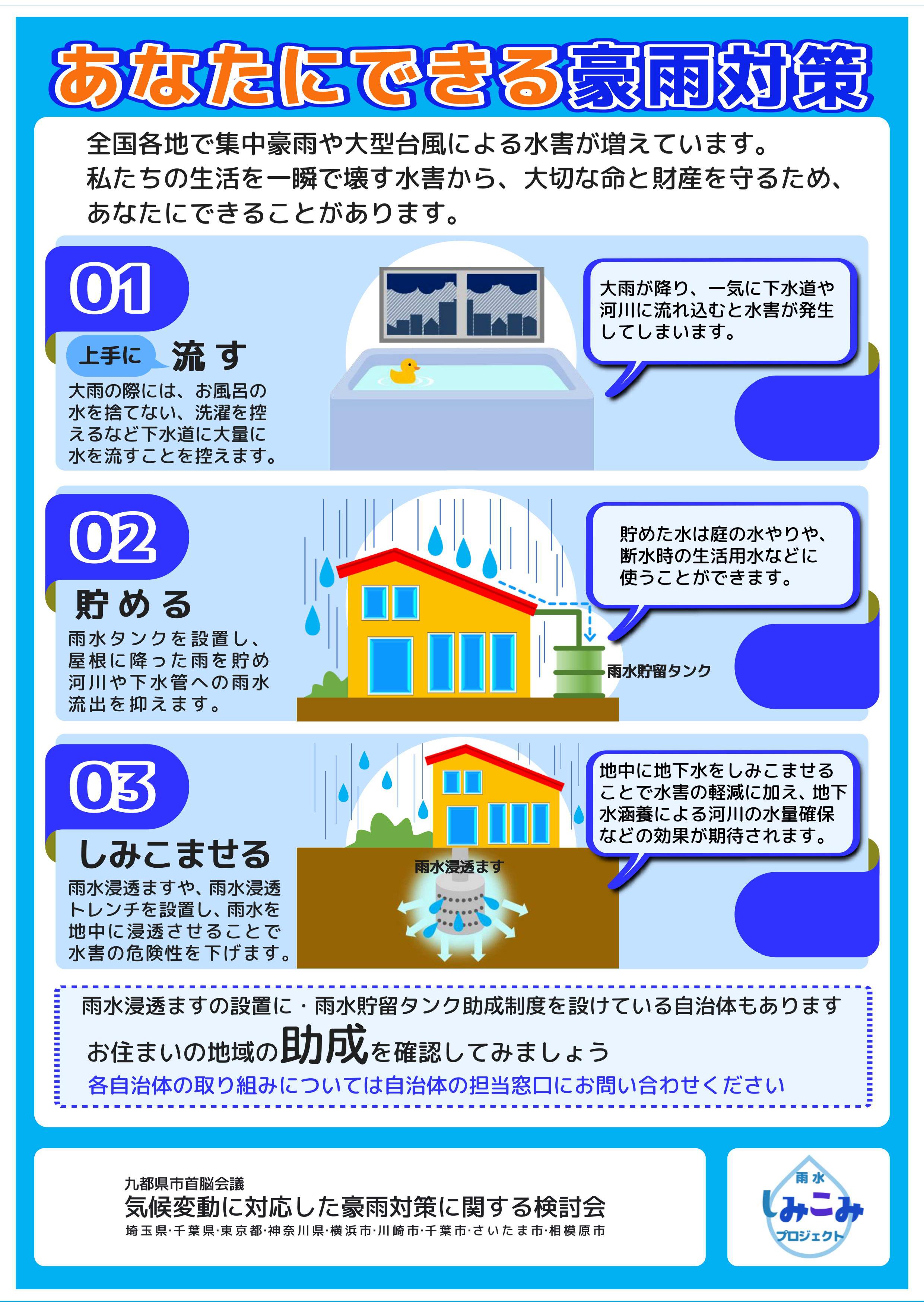九都県市(埼玉県、千葉県、東京都、神奈川県、横浜市、川崎市、千葉市、さいたま市、相模原市)は、激甚化・頻発化する豪雨災害に対応していくため、共同して、それぞれの取組や広域的に共通する課題等の検討を行いました。豪雨による被害軽減を図るためには、河川や下水道の整備にあわせて、多様な関係者が流出抑制策に取り組んでいくとともに、更なる周知を図る必要もあることから、身の回りでできる豪雨対策に関する広報の取組を行うこととしました。