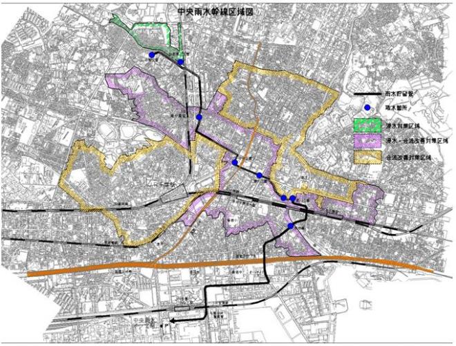 雨天時に、都川・葭川に流れ出ていた雨で薄められた下水を中央雨水幹線に取り込み、中央雨水ポンプ場に設置した雨水滞水池に一時貯留して、降雨終了後に中央浄化センターに送水し、処理することにより、雨天時の水質改善を図ります。