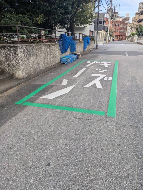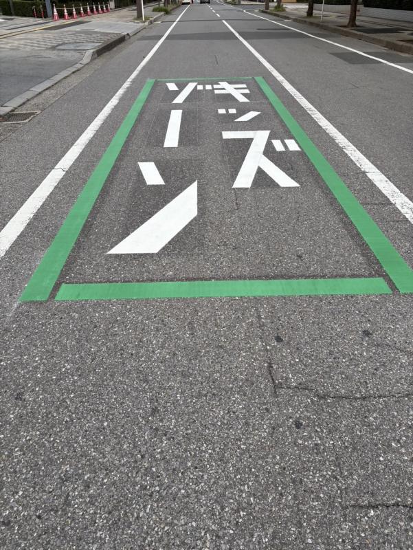 縦7.4メートル、横2.3メートルの外枠を緑色で塗装し、その枠内に「キッズゾーン」の文字を白色で塗装しました。