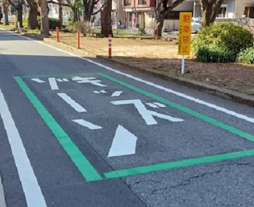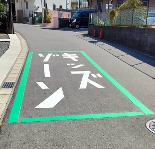 児童の園外活動時の安全性向上のため、園外活動でよく利用する公園までのお散歩コースなどを踏まえて、「キッズゾーン」の路面標示を行うことで、自動車や自転車の運転者、地域住民等に対し注意喚起等を行うものです。
