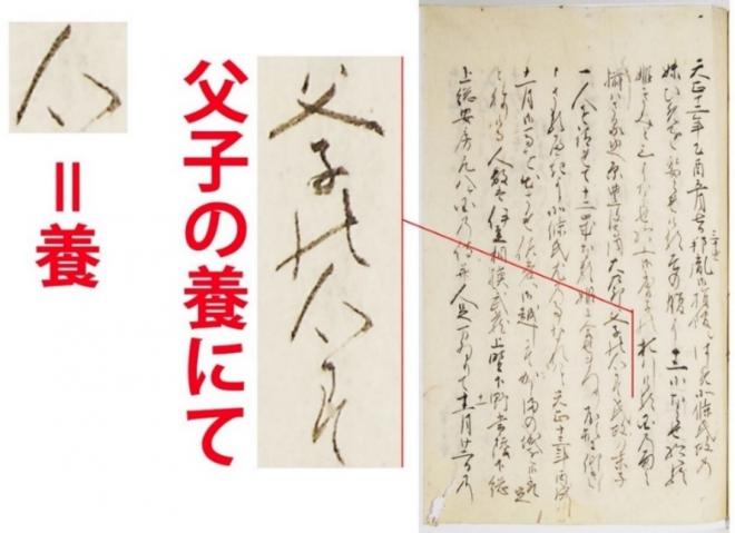 ところで「養にて」と読んだ箇所【図版中央】ですが、これまでは「心にて」とか「人にて」と読まれていました。けれどもそれでは文意が通じませんし、字形【図版左】は「心」でも「人」でもなく、「人」のような字形の間に「 、」が打たれています。