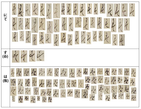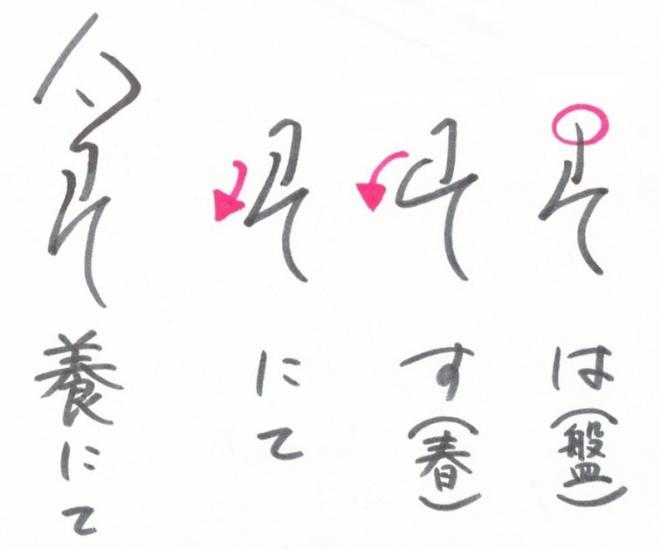 「養にて」の「にて」は、あるいは「す(春)」にもみえる。実際『字典』類の「す」に、これとまったくの同型がみられる。ただし筆跡は個人差があるので、筆者の特徴を把握した上で判断をする必要がある。全体『千学集抜粋』(清宮家本)書写者が筆記する「にて」「す(春)」「は(盤)」は酷似する字形が散見される。そこで同書で用いられる「にて」「す」「は」を摘記して比較し、特徴と相違点を見いだした上で、当該文字を「にて」と判断した。下に掲げた図版を参照されたい。