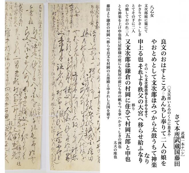 さて本所武蔵国藤田良文のおはすところ、文次郎いえゐのくらにあんちし奉りて、二人の娘をやおとめとして、みつから太鼓うちて神楽申上る也、そのゝち秩父の大宮へ移らせ給ふなり、又鎌倉の村岡に移りて村岡五郎と申也、