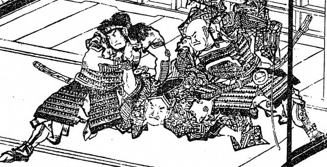北条名越の亭にて忠常蓮景と仍て比企判官を捕えしむる(『星月夜顕晦録』より) |