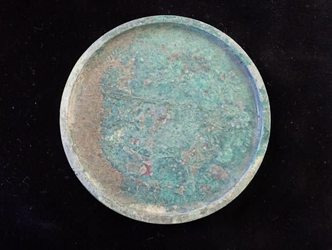今回は、平成9年に当遺跡から発掘された和鏡も展示しています。報告書は未刊行で展示の機会もなかったため、今回の初公開に向けてクリーニング作業を行いました。