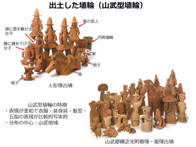 現在の京成千原線のおゆみ野駅前には、かつて人形塚古墳という古墳時代後期後半に築造された全長42.6ⅿの前方後円墳がありました。この古墳を発掘調査したところ大量の埴輪が見つかり、墳丘を巡るように円筒埴輪が並び、墳丘東側には30個体前後の人物埴輪を中心とした形象埴輪が並んでいたことが分かりました。形象埴輪が並べられた墳丘東側は墳丘の平坦部が広く造られており、当初から形象埴輪を並べる意図があったことが分かります(写真1)。