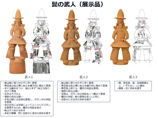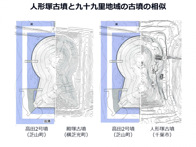 人形塚古墳から見つかったこれらの埴輪は九十九里地域で見られる埴輪ととてもよく似ています(写真2~4)。これらの埴輪を丹念に観察した結果、九十九里地域にある経僧塚古墳(きょうそうづかこふん)に並ぶ埴輪と人物埴輪の表現や製作技法が類似すること、同じ工具で製作された埴輪があることから、九十九里地域で製作された埴輪が、東京湾沿岸の人形塚古墳まで運ばれたことが分かりました。また、九十九里地域の殿塚古墳(とのづかこふん)・姫塚古墳(ひめづかこふん)・経僧塚古墳と人形塚古墳は古墳の設計も共通することから、九十九里地域との密接な交流により造られたことが分かっています(写真5)。