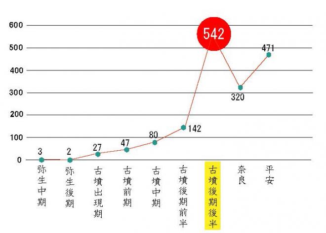 このように、古墳時代後期後半においては九十九里地域とおゆみ野地区に密接な関係性があったことがうかがえますが、その背景には何があったのでしょうか。おゆみ野地区では弥生時代中期~平安時代にかけての竪穴住居が1733軒調査されましたが、古墳時代後期後半~終末期の竪穴住居は536軒で全体の30.9%に達します。前段階の後期前半の竪穴住居の数は142軒で、その増加率は自然増とは考えにくく、外部から人が移住してきたと考えられます(グラフ1)。古墳時代後期後半におゆみ野地区に進出した人々は何処から来たのでしょうか。可能性があるのが山武地域の人々です。おゆみ野地区に築造された人形塚古墳は上述したように山武地域の古墳と墳形や石室の形態、埴輪が類似し、九十九里平野に拠点を持つ勢力が東京湾沿岸に進出してきた可能性があります。おゆみ野地区周辺の村田川北岸河口域の地形が穏やかな潟湖(せきこ=ラグーン)であり、水上交通の要衝として重要であったことから、拠点としておさえたかったのかもしれません。