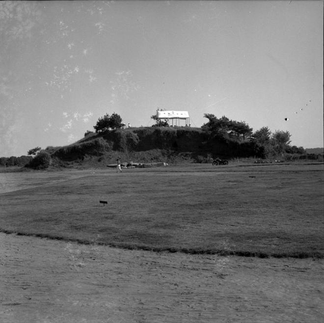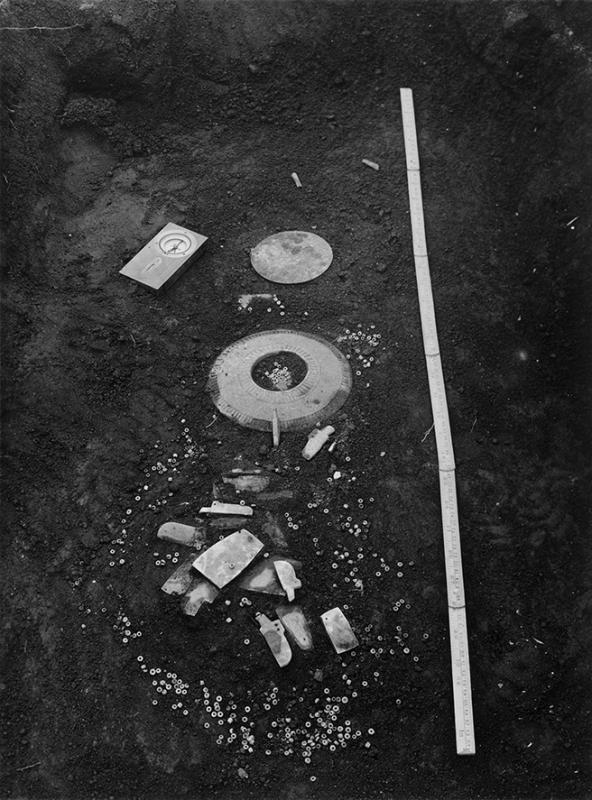 現在の千葉市立生浜東小学校の校庭にはかつて七廻塚古墳(ななまわりづかこふん)という古墳が存在しました。この古墳は直径約54ⅿ、高さが約8.8ⅿもある大型の円墳で、昭和33年に校庭を広げるために発掘調査が行われました(写真1)。その結果、墳丘から3つの埋葬施設と1つの祭祀遺構が見つかりました。写真の石釧(いしくしろ)を含む石製模造品(せきせいもぞうひん)や鏡といった多数の副葬品は祭祀遺構と呼ばれる施設から見つかっています(写真2)。七廻塚古墳からはこれ以外にも、剣や鉾といった鉄製の武器や鉄製の農耕具、石製立花(りっか)が出土しており、これらの遺物の特徴から古墳時代中期前半(おおよそ5世紀の前半)に築造された古墳と考えられています。