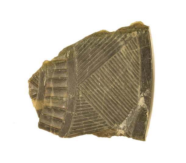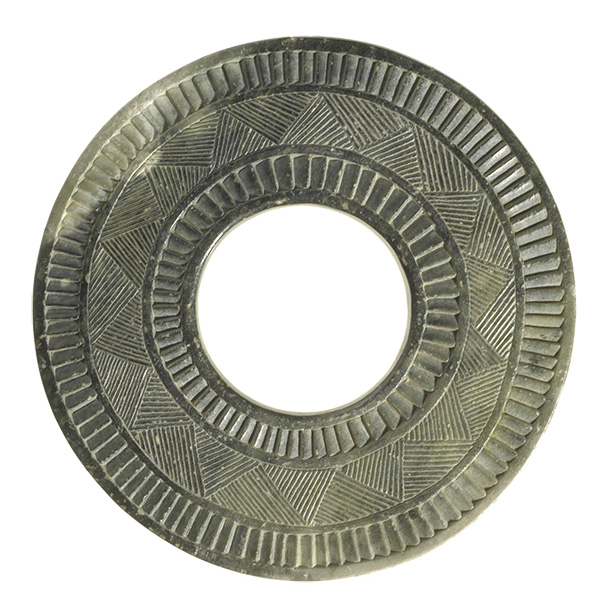 七廻塚古墳の出土品の中でも特筆されるのが、石釧と呼ばれる貝製の腕飾もモデルにした儀器(ぎき)です(写真3)。この石釧は直径16.5cmを測る大型品で、滑石と呼ばれる石材で作られ、表裏面ともに櫛歯文(くしばもん)の間に複合鋸歯文(ふくごうきょしもん)が配された、非常に優美かつ精緻な優品です。また、このような文様構成を持つ石釧は全国的に見ても非常に類例が少ない特異なものです。