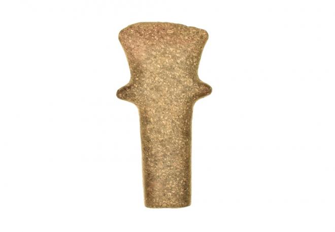 弥生時代中期後葉(約2000年前)の限られた期間に製作されていた石製の儀礼用具で、茨城県南部~千葉県北部にかけて集中して分布します。ゲゲゲの鬼太郎の一反もめんのような奇妙な形をしていることから長年研究者の間で用途について議論がされてきました。実用の農具であるという説や丸木舟を製作するための道具という説など、様々な意見がありましたが現在では儀礼用具ということで意見が一致しています。