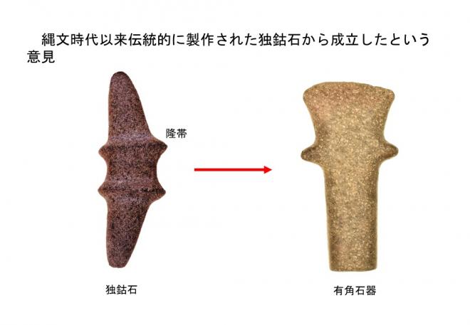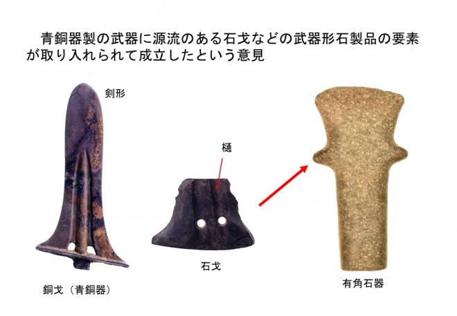 しかし、この形のルーツについてはまだ意見が一致していません。有角石器には青銅製の武器に源流がある石剣(せっけん)や石戈(せっか)と呼ばれる武器形石製品にみられる剣形・鎬(しのぎ)や樋(ひ)といった表現(第2図)が認められるものがあることから、武器形石製品がルーツという意見があります。一方で角の間が縄文時代以来の伝統的な祭祀具である独鈷石(どっこいし)と同様に隆帯状になるものがあることから(第3図)、独鈷石がルーツという意見が併存しています。
