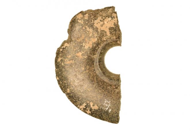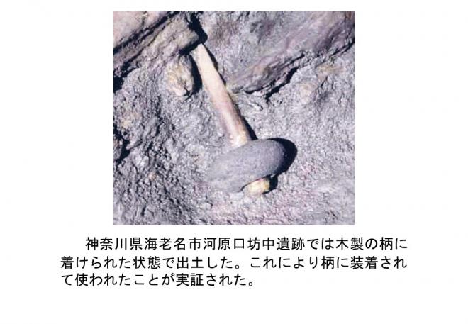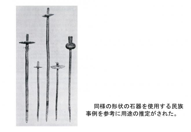 主に弥生時代中期に製作されていた石器の一つです。円形に成形され、中央には孔が開けられています。この石器はこれまで用途をめぐって様々な意見が出されており、土を掘る道具とする意見や、柄に差し込んで用いられた武器の一種とする説がありました。しかし、民族事例などから推定された意見のみで、実際に石器自体に残された使用痕の観察から用途について考えられてきたことはありませんでした(第6・7図)。